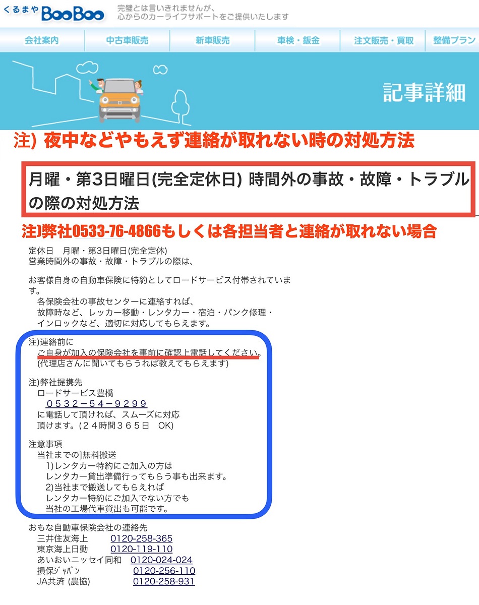 月曜・第3日曜日(完全定休日) 時間外の事故・故障・トラブルの際の対処方法